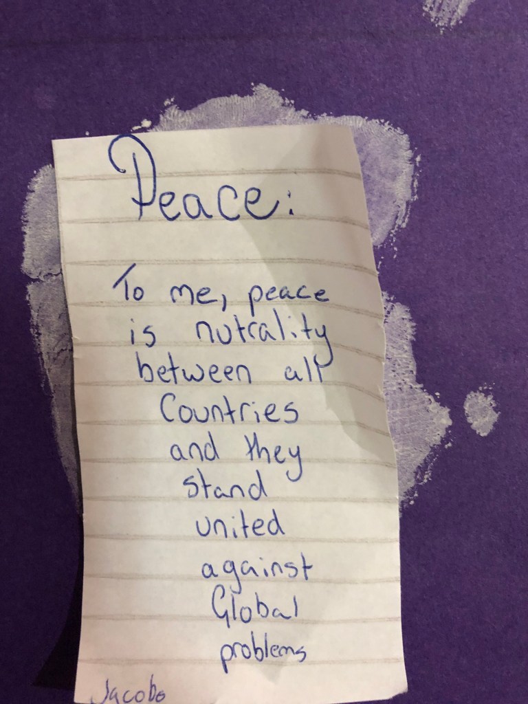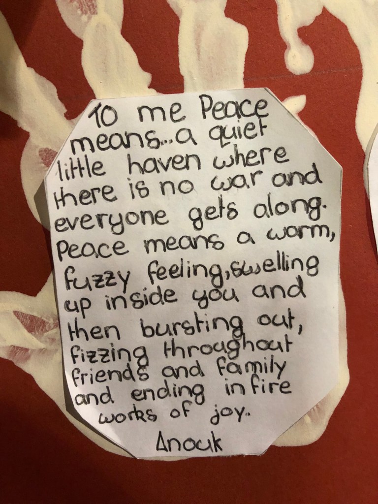 Jacobe wrote, “Peace is neutrality between all countries.” Another child defined peace as “when my mum and I spend time together.” Most striking were Anouck’s words: “Peace means a quiet little haven where there is no war and everyone gets along.” You can check out pictures of the banner and the definitions below.